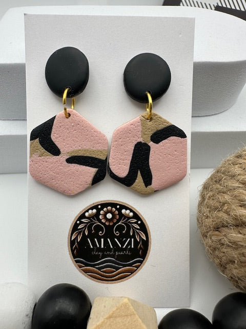 Rooted in bold simplicity, Blush Terrain brings modern edge to a soft color palette. With matte black studs and gold accents grounding the hexagon-shaped clay drops, these earrings showcase a striking blend of blush pink, olive, and jet-black abstract patterns—reminiscent of untamed landscapes and inner strength. A perfect mix of neutral and statement, made for the everyday trailblazer.