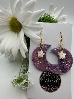 These radiate cosmic beauty with their deep purple crescent moons, textured with golden accents and adorned with delicate pearlescent star charms.
