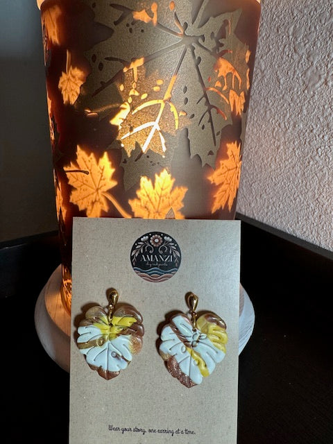 The Fallen Whisper earrings embody the heart of autumn. Handcrafted in a sculpted leaf design, their marbled swirls of gold, ivory, and bronze capture the fleeting beauty of leaves as they drift gracefully to the ground. Bold yet organic, they are a wearable piece of nature’s poetry